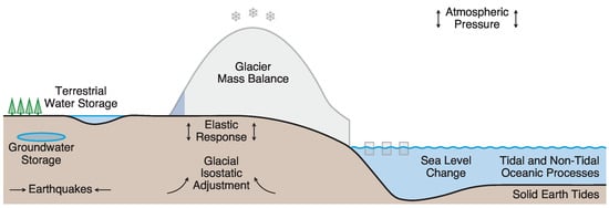 - Tamisiea, M.E.; Mitrovica, J.X. The Moving Boundaries of Sea Level Change: Understanding the Origins of Geographic Variability. Oceanography 2011, 24, 24–39. [Google Scholar] [CrossRef]