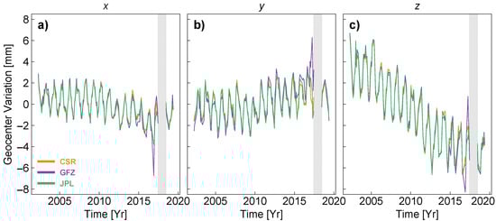 - Sun, Y.; Riva, R.; Ditmar, P. Optimizing estimates of annual variations and trends in geocenter motion and J2 from a combination of GRACE data and geophysical models. J. Geophys. Res. Solid Earth 2016, 121, 8352–8370. [Google Scholar] [CrossRef]