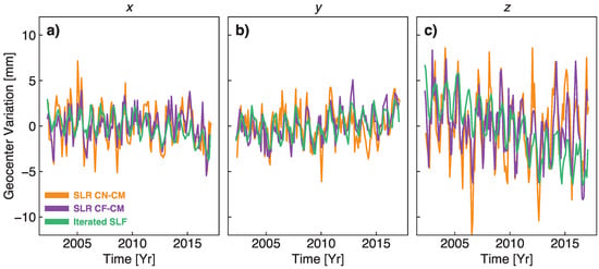 - Collilieux, X.; Altamimi, Z.; Ray, J.; van Dam, T.M.; Wu, X. Effect of the satellite laser ranging network distribution on geocenter motion estimation. J. Geophys. Res. Solid Earth 2009, 114, B04402. [Google Scholar] [CrossRef]