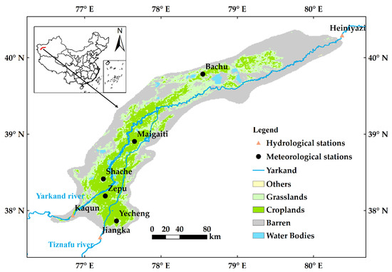 The Yarkand Oasis (37°39′18″–40°23′31″N, 76°31′30″–80°23′38″E) is located in the extremely arid region of northwest China, with a total area of approximately 3.16 × 104 km2 (Figure 1) and is the largest oasis in Xinjiang, China [37], as well as the fourth largest irrigation area in China [38]. It is also a typical representative of the oasis–desert ecosystem (ODES) [39]. It is in the deep Eurasian continent and is under the temperate continental arid climate, with mean annual temperature of 12.0–12.6 °C and relative humidity of 46.6–54.9% from 1988 to 2017. The oasis region has low precipitation, with mean annual precipitation of 62.5–77.6 mm/year, and very high evaporative capacity, where the mean annual evaporation from a 20-cm evaporation pan is 1488–2499 mm/year from 1988 to 2017. The water availability of the oasis mainly comes from the Yarkand and the Tiznafu rivers, which originate from the upper mountainous regions. Both the Yarkand and the Tiznafu rivers are typical rivers fed by glacier and snow melting [40], with mean annual runoff of 69.1 × 108 m3 and 13.3 × 108 m3, respectively.