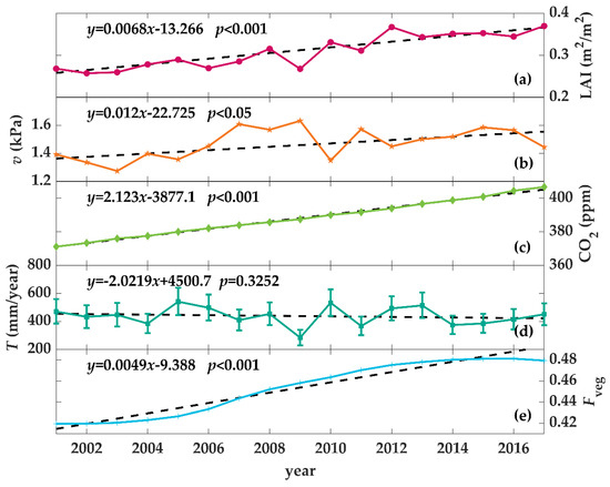 Interannual changes in (a) the oasis-averaged growing season leaf area index (Lregion, m2/m2), (b) growing season mean vapor pressure deficit (v, kPa), (c) growing season mean atmospheric carbon dioxide concentration (Ca, ppm), (d) growing season accumulative transpiration (T, mm/year), and (e) the ratio of vegetation area to oasis area (Fveg) over the period 2001–2017 for Yarkand Oasis. T was estimated from water consumption per vegetation area by multiplying the ratio of vegetation transpiration to regional evaporation, which was calculated according to Equations (15)–(19) and the maximum and minimum of estimated T were shown as the error bars in subplot (d).