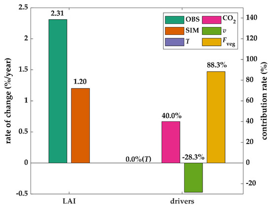 The observed and simulated leaf area index (LAI) in Yarkand Oasis and its causes, together with the relative contribution rate of each cause. is the change rate of LAI, together with the observed and simulated indicating the observed from moderate resolution imaging spectroradiometer (MODIS) and the simulated using the improved Donohue13 model, respectively. , , , and denote the impacts from changes in transpiration, CO2 concentration, vapor pressure deficit, and land use and land cover, respectively.