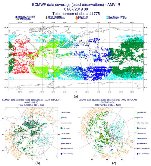 Illustration of European Organization for the Exploitation of Meteorological Satellites (EUMETSAT)’s contribution to the global atmospheric motion vector (AMV) production system over the geostationary satellite ring, with Meteosat-11 (dark turquoise) and Meteosat-8 (dark blue), and dual Advanced Very High-Resolution Radiometer (AVHRR) (cyan) AMV products (a) and over the northern (left) and southern (right) polar areas with Metop-A (red crosses), as well as the Metop-B (dark green) and Metop-C (light green) single and global AVHRR (orange) wind products (b). Images downloaded from ECMWF satellite data monitoring website for the 1 July 2019 at 00:00 UTC. Please note that the gap of data in the tropics in Figure 1a is due to the blacklisting filter used in assimilation process at ECMWF and not due to a lack of satellite data.