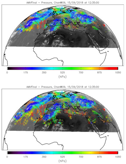 The improvement of numerical weather prediction (NWP) forecast models requires the near-real-time assimilation of meteorological observations that inform the models about the current state of the atmosphere. Therefore, NWP models are continuously fed with a wide range of in-situ observations, like radiosondes, radars, buoys, aircraft measurements, and observations extracted from satellite data. The proportion of satellite data assimilated in NWP models has increased a lot during recent years because these models cover all areas around the Earth, including the oceans and the polar regions, where few in-situ measurements are available [1]. Atmospheric motion vectors (AMV) derived by tracking clouds or water-vapor features in consecutive satellite images, constitute the only upper-level wind observations with good global coverage that help to predict the evolution and displacement of air masses. As mentioned in the final report of the sixth World Meteorological Organization (WMO) Workshop on the Impact of Various Observing Systems on Numerical Weather Prediction held on 10–13 May 2016 at the Shanghai Meteorological Service in China, AMVs are in the top five of observing systems contributing to the forecast performance of global NWP models [2]. The impact of AMVs on forecast performance has increased during the last few years due to the larger amount of AMVs produced, better AMV characterization, and the better use of AMVs in the assimilation processes.