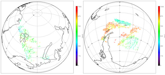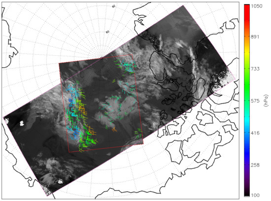 Input data and products considered in the process are projected on a fixed equal-area grid before the tracking step [24]. Figure 8 shows an example of AMVs extracted from a pair of SLSTR images taken over the Arctic Ocean on 4 July 2018 at 15:53:21 UTC and 17:34:20 UTC. The color scale represents the AMV altitude. The operational production of S3/SLSTR AMVs at EUMETSAT is currently foreseen for the end of 2020.