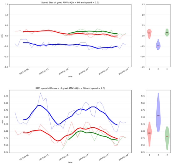 Since 2008, a coordinated effort has been organized to compare the AMV products extracted by different AMV producers. This has resulted so far in a total of three intercomparison studies which have assessed how the satellite-derived cloudy AMVs compare in terms of coverage, speed, direction and altitude. The first two AMV intercomparison studies took place in 2008 and 2014 [16,17,18]. The third AMV intercomparison study, which took place in 2018, included a test using a common quality index (QI) by all the participants [19]. The use of a common QI has proven being very useful in filtering collocated AMVs resulting in an improved statistical agreement. Both working groups I (data production) and II (data assimilation) at the Fourteenth International Wind Workshop (IWW14) encouraged the implementation of a so-called common QI within all the operational AMV algorithms. A common QI module, based on National Oceanic and Atmospheric Administration’s (NOAA) implementation of the EUMETSAT QI process, was made available so that all AMV producers could implement it as part of their algorithms. EUMETSAT implemented it in the MSG AMV algorithm in the release 2.7 of the Meteosat Meteorological Product Extraction Facility (MPEF) ground segment in November 2018. The AMV output file currently contains three quality indicators for each AMV: The usual EUMETSAT QIs with and without forecast check, as well as the new common QI. The next ground segment release 2.8, foreseen in autumn 2019, will include the implementation of the new AMV BUFR sequence that was adopted by WMO in November 2018. This new sequence grants possibilities to fill the output file with new parameters on cloud properties and with diagnostic information that can be useful for the assimilation of AMVs in NWP models.