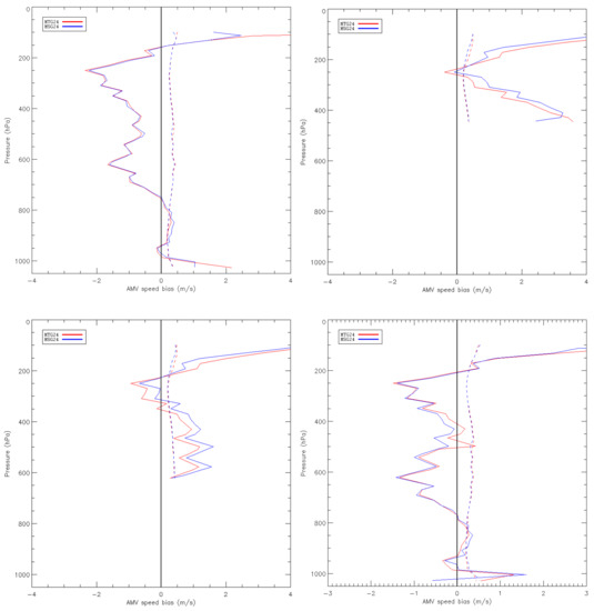 Vertical distribution of AMV speed bias (solid line) and normalized root mean square (NRMS) (dashed line) for the MSG/SEVIRI (blue) and MTG/FCI (red) algorithms using the VIS0.8 channel (top left), the cloudy AMVs from the WV6.2 channel (top right), the cloudy AMVs from the WV7.3 channel (bottom left), and the IR10.8 channel (bottom right). MSG data from 14 May to 14 June 2016 were used for these plots.