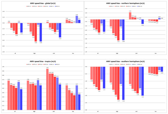 The recent evolution of global and regional forecast models requires the assimilation of smaller-scale observations in order to improve forecast scores. Several ways have been investigated to extract smaller-scale wind information by using rapid-scan imagery or smaller tracer sizes. Garcia-Pereda and Borde (2014) [22] studied the impact of the target-box size on the extraction of AMVs using MSG/SEVIRI images. They showed that the larger the tracer size, the easier the matching, because large target boxes contain a generally good contrast and entropy to select a good tracer. The proportion of good-quality winds (QI > 80) was then found logically larger for large target boxes—58.3% for MTG/FCI 24 × 24—than for small target boxes—52.5% for MTG/FCI 12 × 12. In agreement with previous studies [22,23], AMVs derived using small target boxes tend to be, on average, faster than those generated using larger target boxes, resulting in a reduction of the speed bias against forecast when the speed bias is negative (see Figure 7). The global average speed bias is, in general, negative, except at low levels, which means that AMVs are placed slightly too low in the troposphere. Geographically, the average speed bias was mostly negative in the northern hemisphere (except at mid-levels), positive in the tropics, and negative in the southern hemisphere for the studied period.