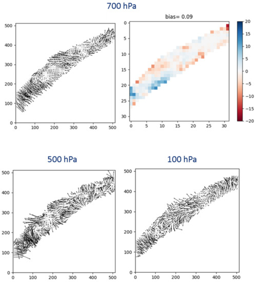 Example of 3D Infrared Atmospheric Sounding Interferometer (IASI) winds extracted at 700, 500 and 100 hPa from Metop A and Metop B consecutive orbits over northern polar areas on 4 July 2018 at 00:46:09 UTC. Speed bias against forecast fields is shown for the 700 hPa retrieval. Data are projected on polar stereographic grid centered on North Pole and have a nominal resolution of 20 km. X and Y axis units correspond to grid coordinates.