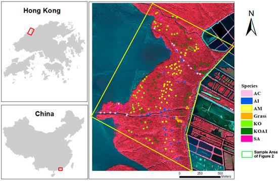 The major mangrove species found in Mai Po include seven native species Kandelia obovata, Avicennia marina, Aegiceras corniculatum, Bruguiera gymnorhiza, Excoecaria agallocha, Acrostichum auerum and Acanthus ilicifolius [28]. An exotic tropical species Sonneratia apetala propagated from the plantation mangrove in Futian National Nature Reserve, Shenzhen. They grow fast and are tall in height and block the sunlight, which affected the growth of native mangrove species and foraging of wetland animals. Agriculture, Fisheries, and Conservation Department (AFCD) of the Hong Kong government monitored the distribution of Sonneratia closely and removed them regularly. In this study, the core area of Mai Po Nature Reserve with an area of approximately 2 km2 was selected as the study area as shown in Figure 1.
