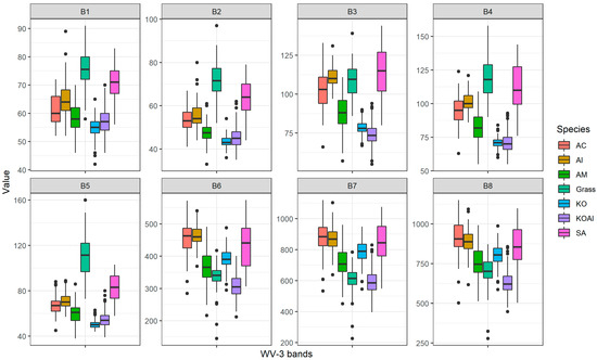 Difference among species in WV-3 MS bands value (B1: coastal blue band, B2: blue band, B3: green band, B4: yellow band, B5: red band, B6: red edge band, B7: NIR1 band, and B8: NIR2 band).
