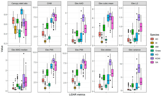 When the LiDAR elevation metrics were input for feature selection, the results showed a slight difference between the 2 m-grid metrics versus the 5 m-grid metrics. 10 metrics were retained from the 2 m-grid metrics while eight metrics were selected from the 5 m-grid metrics. Six metrics were commonly selected including canopy height model (CHM), standard deviation of elevation (Elev stddev), variance of elevation (Elev var), canopy relief ratio, absolute average deviation of elevation (Elev AAD) and Elevation L2 (Elev L2). In the 2 m-grid, metrics 99th and 95th percentile height (Elev P99 and Elev P95), mean and median of elevation were also considered important. Additionally, skewness of elevation (Elev.skewness) and the number of returns above the mean height/number of total first returns × 100 ((All returns above mean)/(Total first returns) × 100) were chosen from the 5 m-grid metrics. Figure 4 describes the difference among species in the 10 important LiDAR metrics.