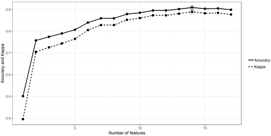 The optimal subset sizes ranged from 7 to 14 based on all feature selection exercises, which was consistent with previous studies [7,21]. Figure 5 shows the variation of overall accuracy and Kappa generated from the RFE RF model with changes in the number of features used in the combined data. Overall accuracy and Kappa coefficient kept increasing when the number of features increased. The improvement is more significant when the subset sizes were less than 10. When beyond 10 features, the improvement was dampened and revealed a trend of gradual saturation between 11 to 15 features. In this example, the highest overall accuracy (0.91) and Kappa (0.89) were achieved with 14 features used. When the subset size was larger than 15, Kappa coefficient saturated and showed a decline with more features added.