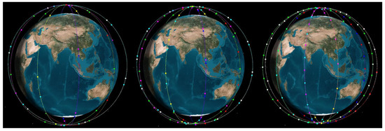 Since most of the LEO constellations are still in the preparatory stage, three kinds of LEO constellations are designed for the simulation of ISLs. As for satellite numbers, 60, 120, and 192 are selected for comprehensive analysis. It is noted that the 60-satellite design is also adopted by the HongYan constellation program. All of these LEO satellites are evenly distributed in 10 or 12 equally spaced orbital planes with an altitude of 1000 km. In the design of orbit type, polar orbit is chosen. For simplicity, the pseudo random noise (PRN) codes of these constellations are arranged from 1 to 60, 1 to 120, 1 to 192, respectively. Detailed parameters of the designed LEO constellations are shown in Table 1 and the configurations are displayed in Figure 2.