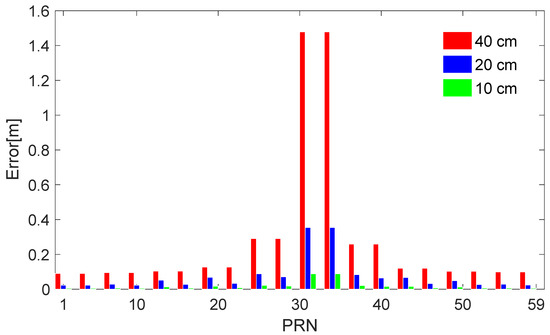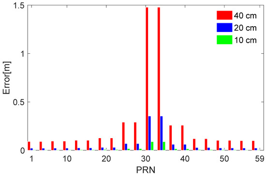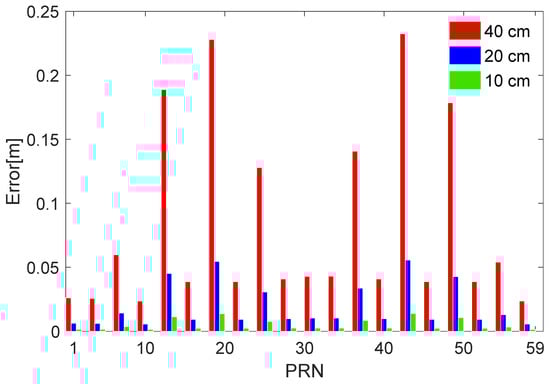 First, in order to verify the impact of link ranging accuracy on the orbit determination, we select 60-LEO constellation detailed in the Table 1 for test. Experiments are carried out with 40, 20, and 10 cm ISL ranging accuracy and the orbital errors in the radial, along-track, cross-track, and 3D directions are shown in the Figure 3, Figure 4, Figure 5 and Figure 6. From these figures, it can be clearly concluded that higher ranging accuracy leads to lower orbital errors in every direction. It is because that observation errors which compose in Equation (15) are smaller during adjustment process. Average orbital errors of 60-LEO constellation after POD with 40, 20, and 10 cm ranging accuracy are shown in the Table 3. When the ranging accuracy is 40 cm, POD result is poor with average 3D error of 0.358 m but it turns to be much better when the ranging accuracy is 20 or 10 cm. It can be calculated that compared to the ranging accuracy of 40 cm, the 20 and 10 cm schemes bring about 76.0 and 93.9% 3D orbital error reductions, respectively.