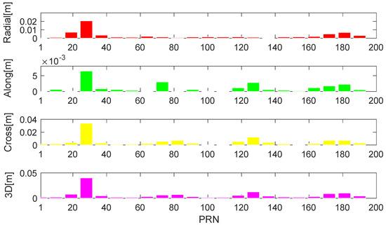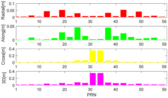 Using ISL measurements, POD with center of gravity reference mentioned in Section 3.4 can be achieved. In order to study the factors affecting the POD results, we carry out comparative experiments with several sets of satellite numbers and different observation accuracy. Because the numbers of satellites are very large in our experiments, for the sake of convenience the satellites are displayed at intervals 3, 6, 9 of PRN number for 60-, 120-, 192-LEO constellations, respectively. This means there are 20, 20, 22 satellites to be shown in the 60-, 120-, 192-LEO constellations, respectively.