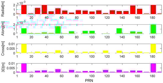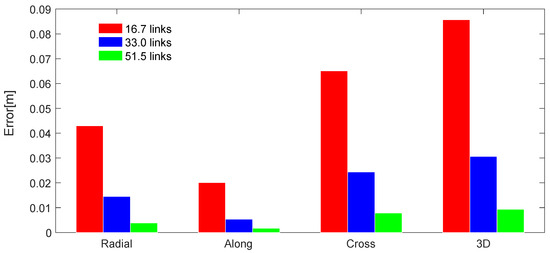 Then, several experiments are carried out to verify the impact of link numbers on the orbit determination. It is obvious that the more satellites in a constellation, the more ISLs will be formed, so we select 60-, 120-, and 192-LEO constellations detailed in the Table 1 for further study and the 20 cm ISL ranging accuracy is chosen for all constellations. The orbital errors of these constellations are shown in the Figure 7, Figure 8 and Figure 9. Figure 10 shows the average orbital errors in different directions of these constellations. Average numbers of links per satellite in these constellations are 16.7, 33.0, and 51.5, respectively. Obviously, the more satellites, the more links there are, which contributes to the smaller orbital errors in all directions. It is because more link observations, which means the number of rows in matrix in Equation (15) are larger, brings stronger geometric constraints to the coordinates of the satellites. The average 3D orbital error is 0.086 m for 60-LEO constellation while the errors are 0.030 and 0.009 m for 120- and 192-LEO constellations with 65.1 and 89.5% reductions, respectively.