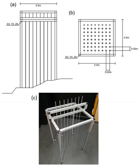 The frame consisted of a 0.5 m × 0.5 m quadrat on four variable height legs (Figure 1). The size of the frame developed in this study was chosen to align with similar practices in other ecological studies [48,49,50]. The origin of the coordinate system was the lower-left inner corner of the quadrat frame. The variable height legs allowed the frame to be levelled using a spirit level bubble approximately 1 m from the ground. A sliding rack was used to allow the collection of 8 point intercept measurements simultaneously along the x-axis. This rack could be located at eight locations along the y-axis, allowing a total of 64 measurement points to be measured at known locations within the coordinate system defined by the frame.