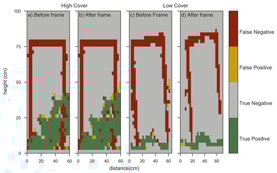 The validation of the representation of vegetation within the point cloud can be achieved both on the raw data and on secondary metrics (such as vegetation cover and vegetation top height) based on the frame measurements. For validating the raw point cloud information, the presence or absence of voxel data can be directly compared. By determining the number of true and false positive and negatives, the completeness of the point cloud representation can be evaluated. A True Positive (TP) result indicates a point that was present in both the reference measurement and point cloud. A True Negative (TN) result highlights that a point was not present in both the point cloud and reference measurements. A False Negative (FN) indicates the presence of a reference measurement with no corresponding filled voxel. A False Positive (FP) indicates the presence of a filled voxel that does not correspond with a reference measurement. As there is likely to be a higher number of empty voxels in most environments, a Matthew Correlation Coefficient (MCC) was utilised to provide a measure of classification accuracy. This measure has been used previously in the application of point cloud analysis [52,53] to compare observed and predicted binary classifications where the classes are imbalanced [54]. The properties of the intercept can also be examined to determine the type and location of missing information in the point cloud. The error in intercept height can then be summarised using measures of difference such as Root Mean Square Error (RMSE) or Mean Absolute Deviation.