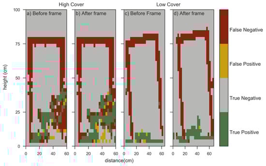Visualisations of the agreement between point cloud data captured at high cover and low cover plots using TLS workflows. The differences are shown between point clouds with and without the frame in place: (a,c) the comparison to the point cloud captured before the frame was introduced; and (b,d) the comparison after to the point cloud captured after the frame was removed.
