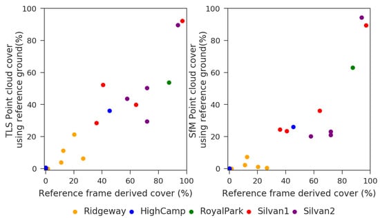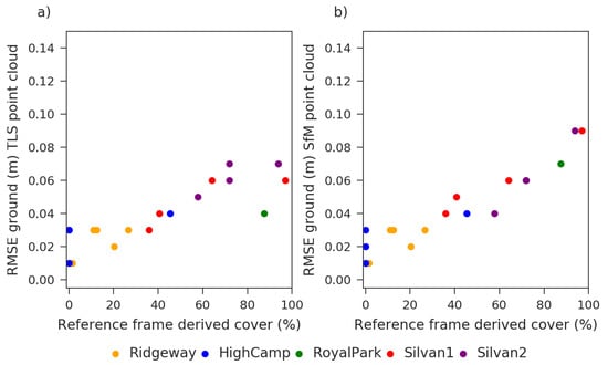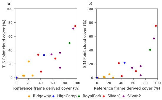 TLS (a); and SfM (b) point cloud cover derived using reference ground measurements compared to cover derived from reference frame measurements.