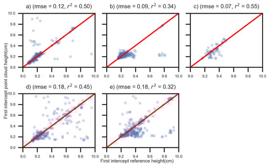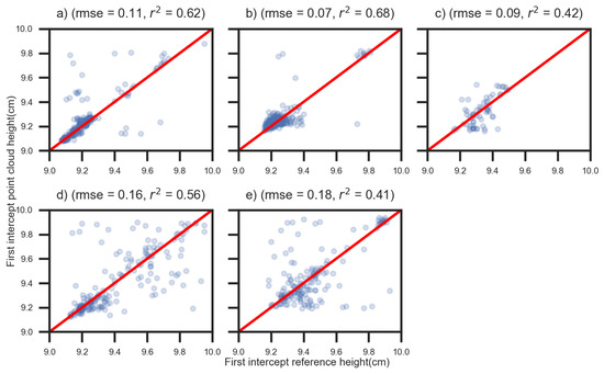SfM estimate of first intercept height derived from point clouds in comparison to direct measurements at: (a) High Camp; (b) Ridgeway; (c) Royal park; (d) Silvan1; and (e) Silvan2. Both the x and y axes show height relative to the origin of the reference frame.