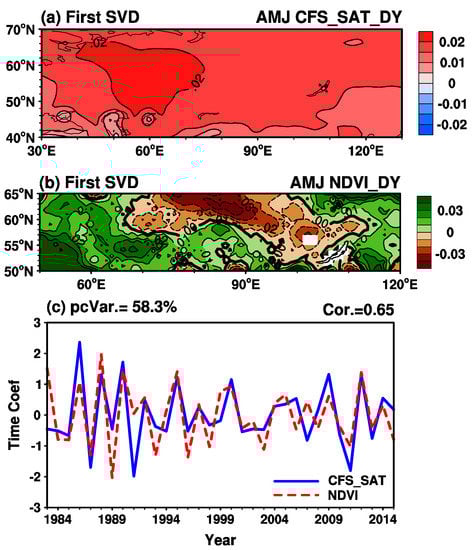 Spatial patterns for the first paired mode of the difference in years (DY) of (a) spring (April–May–June (AMJ)) surface air temperature (SAT) from CFSv2 and (b) spring Eurasian NDVI (NDVIEA) via a singular value decomposition (SVD) analysis during 1983–2015. (c) The corresponding normalized time series of the expansion coefficients for the paired mode; their correlation coefficient is shown above the top right-hand corner, and the variance explained by the first mode is shown above the top left-hand corner.