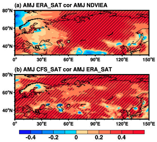 (a) Correlation between area-averaged spring (April–May–June (AMJ)) NDVIEA index and the surface air temperature (SAT) from ERA-Interim during 1982–2015. (b) Correlation between the spring SAT from ERA-Interim and CFSv2 during 1982–2015. Regions marked by slashes are significant (α = 0.10; t-test).