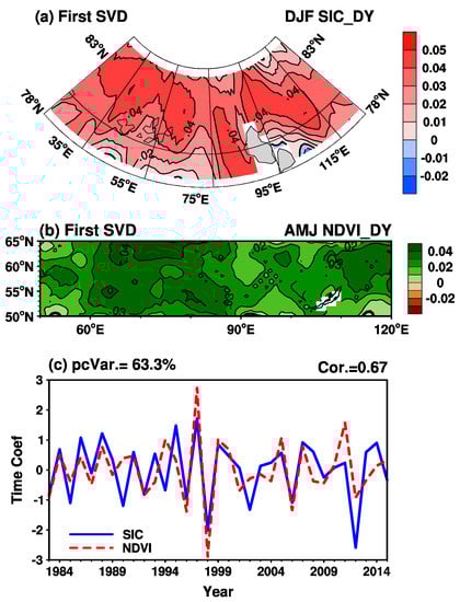 The decrease in the Arctic sea-ice cover and its effects on weather and climate, especially over middle and high latitudes in the Northern Hemisphere, has become a hot topic [85,86,87,88]. Ji and Fan [53] found that the Arctic sea-ice cover is positively correlated with NDVIEA. Figure 4 depicts the leading paired mode of the SVD analysis of the DY of winter sea-ice cover over the Barents Sea, (78°–85°N, 25°–130°E), abbreviated as SICBS), and spring NDVIEA. The leading SVD mode shows that the positive SICBS anomalies and the overall positive NDVIEA anomalies are optimally correlated. The leading paired mode explains 63.3% of the total variance, and the correlation coefficient between the time series of expansion coefficients is 0.67 (significant at the 1% significance level; Figure 4c).