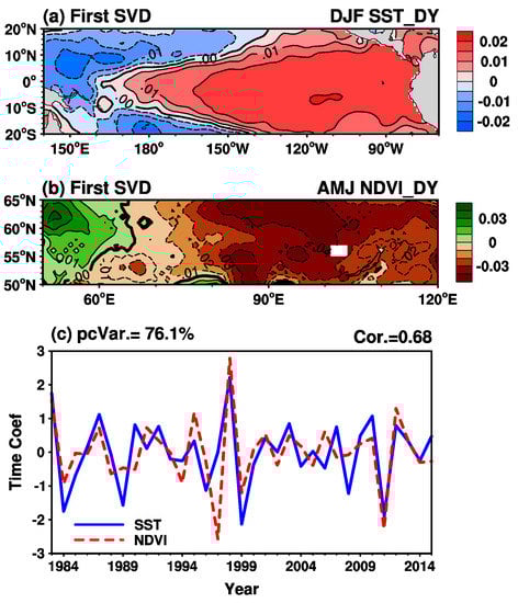 Spatial patterns for the first paired mode of the DY of (a) winter (December–January–February (DJF)) sea surface temperature (SST, tropical Pacific) and (b) spring (April–May–June (AMJ)) NDVIEA via SVD analysis during 1983–2015. (c) The corresponding normalized time series of the expansion coefficients for the paired mode; their correlation coefficient is shown above the top right-hand corner, and the variance explained by the first mode is shown above the top left-hand corner.
