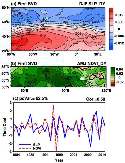 The NAO is a prominent atmospheric circulation pattern characterized by a large-scale seesaw pattern of sea level pressure between the Icelandic low and Azores high that dictates the climate variability of North America and Eurasia [100]. Li et al. [23] explored the linkage between late winter (January–February–March) NAO and spring Eurasia NDVI and found that positive-phase late winter NAO can lead to higher than average NDVIEA. In the first paired mode of the SVD analysis of sea level pressure (20°–80°N, 90°W–40°E) and NDVIEA, the sea level pressure shows a similar pattern to positive-phase NAO, and NDVIEA shows overall positive anomalies (Figure 6). The variance explained by the first paired mode is 62.5%, and the correlation coefficient between their time series of expansion coefficients is 0.58 (significant at the 1% significance level). The NAO might therefore be an important factor of influence on NDVIEA.