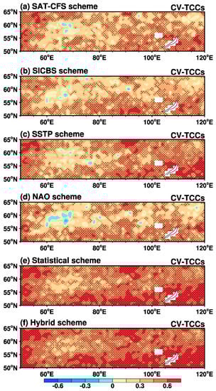 The temporal correlation coefficients (TCCs) between the spring (April–May–June (AMJ)) NDVI3g data and the cross-validation hindcast results of the (a) surface air temperature (SAT-CFS) scheme, (b) sea-ice cover (SIC) scheme, (c) sea surface temperature (SSTP) scheme, (d) North Atlantic Oscillation (NAO) scheme, (e) statistical scheme and (f) hybrid scheme during 1983–2015. Dotted regions are significant (α = 0.05; t-test).