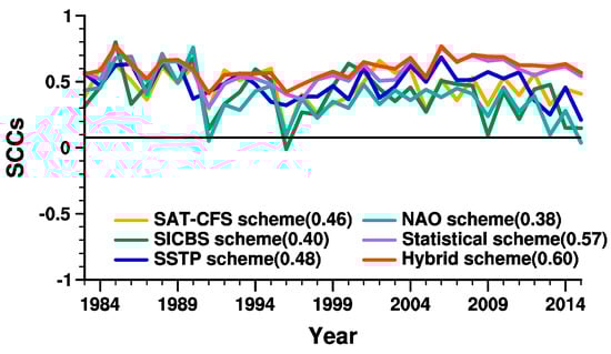 The spatial correlation coefficients (SCCs) between the spring (April–May–June (AMJ)) NDVI3g data and the cross-validation hindcast results of the schemes during 1983–2015. The reference line is the significant value for SCCs at the 1% significance level. Numbers in brackets in the legends are the averaged SCCs for the schemes during 1983–2015.