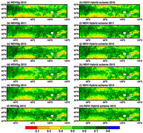 Spring (April–May–June (AMJ)) NDVI over Eurasia during 2010–2015, where (a–f) are from the NDVI3g data and (h–m) are from the independent hindcast results of the hybrid scheme.