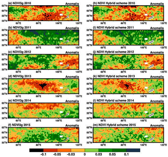 Spring (April–May–June (AMJ)) NDVI anomalies over Eurasia during 2010–2015, where (a–f) are from the NDVI3g data and (h–m) are from the independent hindcast results of the hybrid scheme.