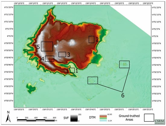 Fieldwork to verify the presence and ostensible cultivation function of the features revealed by the LiDAR, and to validate and calibrate the LiDAR elevation measurements, was scheduled for 16–29 June 2019. In preparation, six priority areas were selected for inspection (Figure 5). These areas were selected chiefly on the basis of two criteria: Including particularly evident and representative examples of the features visible in the LiDAR data, and being relatively lightly covered by vegetation. The latter criterion was important to the performance of the Global Navigation Satellite System (GNSS) equipment used for verification and validation, which must have a relatively unobstructed view of the sky to achieve the most precise measurements possible (GNSS systems use global positioning system satellites as well as other constellations of positioning satellites). Temwen itself is almost entirely covered by thick vegetation, but we placed one of our areas of interest, Area 6, within Nan Madol, where some of the islets are relatively clear of vegetation. This allowed us to fully exploit the GNSS system’s precision and gather highly accurate geospatial measurements (see Section 3.1 for details). For later analyses, many of which will be relevant to the Sustainable Conservation Plan, these data will be quantitatively compared with the LiDAR data, to verify and validate the elevations measured for Nan Madol’s islets.