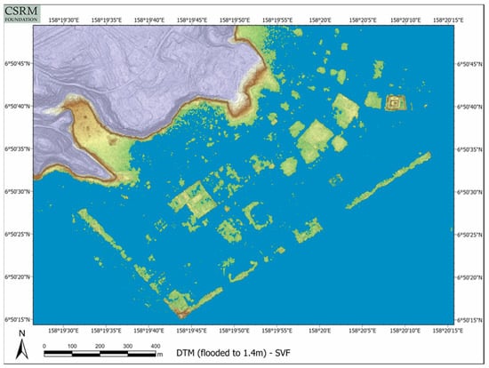 Prior archaeological fieldwork suggests reasons for the differential preservation of Nan Madol islets that is apparent in the LiDAR models. The findings from this fieldwork indicate that the human occupation of areas offshore of Temwen Island predated the artificial islets and monumental structures that comprise Nan Madol [5,6,8,23]. Nan Madol’s most intact, and many of its most notable, islets and structures lie along a southwest–northeast axis. These are the islets most visible in Figure 6. Athens, drawing upon his excavations and surveys at the islets [3,22,23], posits the presence of natural islets along that axis that predated Nan Madol’s islets. He suggests that the augmentation of these natural islets with basalt and coral rubble inspired the construction of other, later islets both nearer to shore and farther seaward ([5], p. 21).