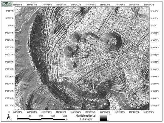 Multiple products derived from the DTM were generated to highlight the archaeological features. We briefly describe seven of them here. The first derived product is a composite shaded relief image composed of 32,310 individual shaded relief products that were generated using a highly parallelized custom application written in C++. Azimuth angles from zero to 359 and elevation angles from 0 to 90, which effectively represent a solar illumination dome over the region of interest, were used to ensure that subtle terrain features that might be visible only under specific geometric conditions could be highlighted. The shaded relief results of each azimuth and elevation angle combination were summed and then divided by the total number of products used, creating a normalized output. This derived product can be generated using standard commercial and open-source GIS software packages through relatively straightforward Python scripting, but the process would likely be very time consuming due to the single-threaded nature of those applications, unless some batch job orchestration system, taking advantage of multiple CPU cores, multiple computers, or both, was used. That is one reason why simpler versions of this product, like the multidirectional hillshade discussed below (Figure 4), are generally created instead.