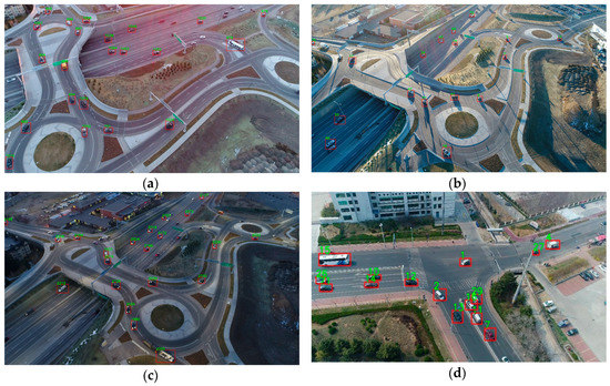 The proposed vehicle tracking-by-detection approach was evaluated based on various test videos, as shown in Figure 7, including three videos collected by the DJI Phantom 4 Pro, one video of UAVDT-Benchmark dataset (M0101), and two videos of FHY-XD-UAV-DATA (scene 2 and scene 5) [69]. Three DJI videos including video 1 (DJI_0006) collected in a typical lighting condition (Figure 7a), video 2 (DJI_0013) collected in a late afternoon with long vehicle shadows (Figure 7b), and video 3 (DJI_0001) recorded in dawn with vehicle lights (Figure 7c) were kept aside for testing the proposed approach. Although the test videos were captured from the same scene as that of the training videos (Figure 4c), these three videos had never been seen by the vehicle tracker. UAVDT-Benchmark dataset (M0101) shown in Figure 7d is also different from the training video (M0606) in Figure 4d. Scene 2 (rural street) and Scene 5 (intersection) of dataset FHY-XD-UAV-DATA, shown in Figure 7e,f, were also completely new videos and never used for training.