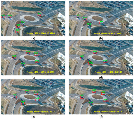 Unmanned aerial vehicles (UAVs) are popularly applied in a large variety of remote sensing and monitoring applications in both civil and military contexts [1,2,3]. Intelligent transportation and traffic monitoring are found to be among the applications, where UAVs are receiving increasing interest [4,5,6,7]. Data for traffic monitoring and analysis can be collected by various sensors, such as lidar, radar, and video cameras. Among these, video-based traffic analysis is receiving more attention due to the significant advancement of machine learning and computer vision techniques [8,9,10]. Multi-vehicle detection and tracking is a fundamental task in the video-based analysis of traffic that can be used for various purposes, e.g., speed control [11], vehicle counting [12], automatic plate recognition [13], and incident analysis [14]. Traditionally, traffic videos are collected by ground surveillance cameras at fixed positions and orientations [15,16,17]. However, in complex road scenarios, when the traffic moves through multiple roundabout or interchange roads, vehicles’ maneuvers cannot be tracked completely using these traditional camera setups [18]. In these cases, UAVs can be complementary platforms to collect traffic videos from various altitudes and viewpoints. Vehicle detection-and-tracking in UAV videos is both rewarding and challenging. For instance, at a higher altitude and with an oblique view direction, a larger field of view can be offered that increases the area under surveillance. However, this advantage comes with the challenge of causing the vehicles to appear in significantly varying resolutions. An instance of this problem is shown in Figure 1, where vehicle #16 is observed in an area of 7125 pixel2 at the bottom left corner of the video frame (Figure 1b) compared to the same car seen a few seconds later in a bounding box of 1925 pixel2 at the top left corner of the video frame (Figure 1e). Additionally, in multi-object tracking (MOT) tasks, one of the most significant challenges is to alleviate incorrect identity switches. That is, a vehicle cannot be tracked efficiently unless it is identified as the same object for the whole or most of the video frames, in which it appears. The state-of-the-art in MOT is conventionally focused on tracking pedestrians and sport players [19]. Comparatively, tracking vehicles while correctly re-identifying (Re-Id) them is more challenging since appearance similarities among vehicles are much more than humans as vehicle models and colors are limited [20]. In the field of vehicle tracking, Re-Id approaches focus on re-identifying a vehicle across multiple videos captured by different cameras as opposed to re-identifying a vehicle in the same video where it undergoes severe appearance changes [21,22,23]. This problem becomes even more pronounced in UAV videos. Since vehicles appear smaller in such videos, their appearance features also become more limited and less distinctive. Moreover, using ground surveillance cameras, the vehicles are observed as they drive straight in parallel directions. They may also turn a few degrees, e.g., 90 degrees to take a left or right turn [18]. Therefore, the appearance features of the same vehicle do not vary much in a ground surveillance video [18,20,24]. In UAV traffic videos, however, when vehicles drive through roundabouts or interchange roads, their appearance features vary considerably depending on their relative orientation to the camera. An instance of this challenge is presented in Figure 1. This sample video is captured from approximately 70 m above the roundabout level with close to 40 degrees tilt. The appearance features of vehicle change aggressively as the vehicle completes its maneuver from the exit ramp through two roundabouts to the highway entrance ramp. In this case, it is exceptionally challenging to robustly track the vehicle and consistently re-identify it through its whole trajectory. Vehicle occlusion by either other vehicles or road assets, such as traffic signs, is also a notable problem in traffic flows captured by UAVs. Finally, since the UAV moves freely, no assumptions can be made about the camera being stationary. That is, the optical flow happening in the video is the result of both the scene flow and the camera motion; this makes the vehicle motion-estimation task less trivial.