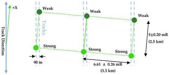 Ice, Cloud and Land Elevation Satellite-2’s (ICESat-2) beam pattern on the ground. The pattern has six beams organized in a 2 × 3 array. By slightly yawing the spacecraft, this will create three pairs of beams on the ground. Each pair contains a strong beam and a weak beam, with an energy ratio of 4:1. The separation for each pair is 90 m, and this can be changed by changing the yaw angle.