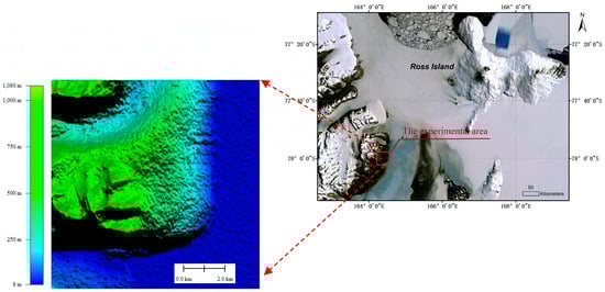 (1) The terrain precisely surveyed by airborne lidar data. The lidar data for the experimental area were derived from the high-precision airborne lidar data “2014–2015 lidar survey of the McMurdo Dry Valleys” [32] provided by the OpenTopography platform [33]. The dataset was measured during the southern hemisphere summer of 2014 to 2015 and collected with the Optech Titan Multispectral sensor. The lidar point density varied from 2 to 10 pts/m2 with an average of about 5 pts/m2. The vertical and horizontal accuracies are estimated to be 0.07 m and 0.03 m, respectively. In our experiment, horizontal 1 m resolution Digital Elevation Model (DEM) data were generated based on the lidar data to serve as the matching terrain for the subsequent calibration.