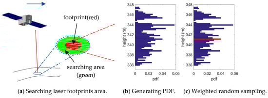 Step 3: Weighted random sampling. Due to the randomness of the return photon’s position in the footprint, we also used the probability method to determine the measured photon. Firstly, the number of return photons for an outgoing laser pulse needed to be determined. For the photon-counting laser altimeter, the number of detected photons associated with each shot is a function of the transmitted laser energy, surface reflectance, scattering and attenuation in the atmosphere. The predicted number of return photons received per shot for an ice sheet surface was 0.6–12, and there will be 1/3–1/9 as many photons returned from terrestrial surfaces as from ice and snow surfaces [10]. Here, the number of return photons, N, within the current footprint was generated randomly, ranging from 0 to 2. Secondly, the generated elevation PDF was used as the weight to randomly sample the elevation range, and an elevation value was obtained. This value was the final simulated elevation of the current footprint. Thirdly, the laser ranging value was obtained by the inverse solution of the geometric relationship of the laser altimeter. This weighted sampling process was repeated N times to obtain N results.