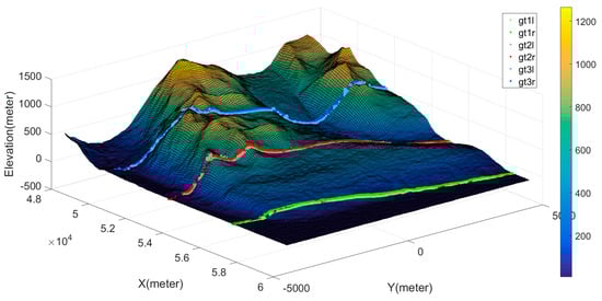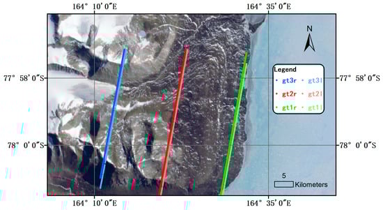 (3) The ICESat-2 data. The ICESat-2 data surveyed near McMurdo Dry Valleys on 2 November 2018 [34] were used in this paper. The Track ID is 534. The ground tracks of the data are shown in Figure 4, which contain three pairs of footprints. gt3r, gt2r and gt1r are the strong beams, whose energy is about four times that of the weak beams.