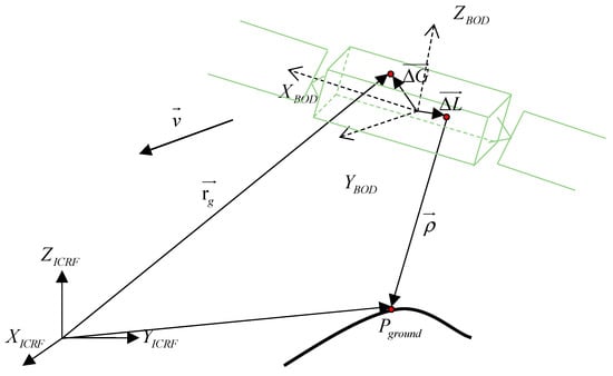 A geometric model of the spaceborne laser altimeter [25,35] is shown in Figure 5. Within this model, is the coordinate system of the satellite body, is the offset of the GPS antenna in the satellite body coordinate, is the laser fire point in the satellite coordinate, represents the international celestial reference frame (ICRF) coordinate system, is the position vector of the GPS antenna, is the velocity direction and is the direction vector of the laser boresight. The relationship between the laser boresight and the satellite body coordinate system is defined in Figure 6, where is the angle between the laser boresight and − direction, and is the angle between the projection direction of the laser boresight on plane and the axis. is the geolocation of the laser footprint in the international terrestrial reference frame (ITRF), which can be expressed by Formula (1).