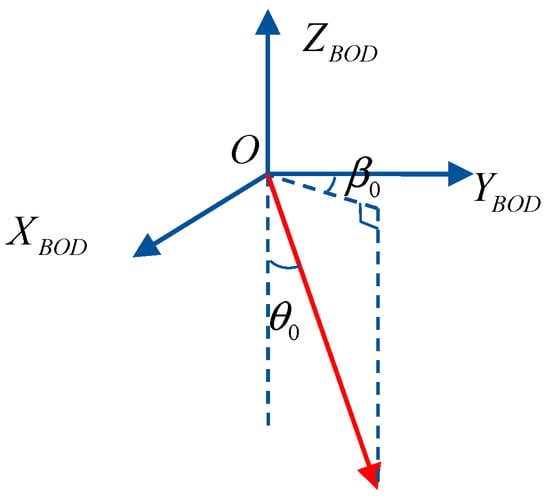The relationship between the laser boresight vector and the coordinate system of the satellite. is the intersection angle between the laser emission direction and − direction, is the intersection angle between the projection direction of the laser boresight on plane and the axis.