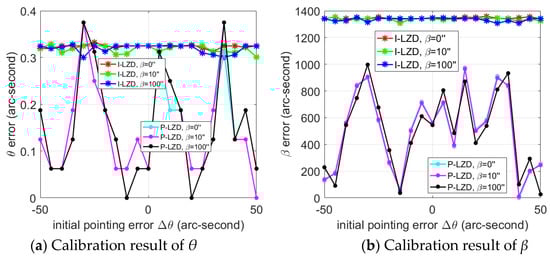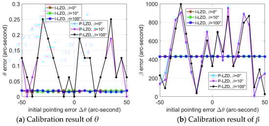 As can be seen from Figure 7a, when 1 km length tracks are used, the calibration error of θ is ~0.3 arc-seconds for the I-LZD algorithm, corresponding to a geolocation error of ~0.7 m. Moreover, the calibration results change little with different initial errors of θ and β. For the P-LZD algorithm, most of the calibration errors are better than the I-LZD algorithm. However, its calibration errors vary greatly with the initial errors of θ and β. Figure 8 shows the result when 2.5 km length tracks are used. The calibration result of θ is below 0.05 arc-seconds for the I-LZD algorithm, corresponding to a geolocation error of ~0.1 m. At the same time, its calibration results maintain good consistency with different initial errors. For the P-LZD algorithm, the calibration errors are slightly lower than the result when 1 km length tracks were used. Meanwhile, its calibration errors still fluctuate with different initial errors.