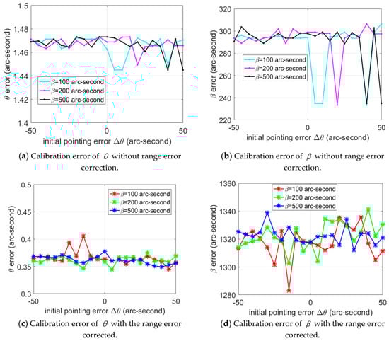 The influence of range error on the calibration results of θ and β. (a) and (b) show the calibration errors of θ and β without range error correction; (c) and (d) show the calibration errors of θ and β when the range error is corrected. In addition, 1 km length tracks were used.