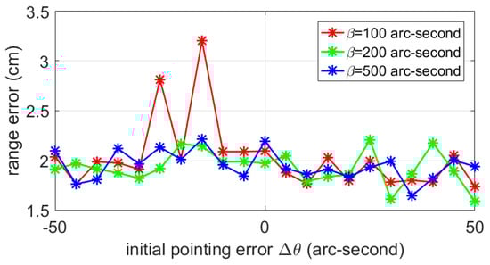 Due to the influence of the atmosphere, the ranging delay correction is typically between −2.6 and −0.9 m, depending on the atmospheric state [10]. A total range error of 50 cm was assumed in our simulation, and the I-LZD method was used to calibrate the pointing angle and range error. The result is shown in Figure 10.