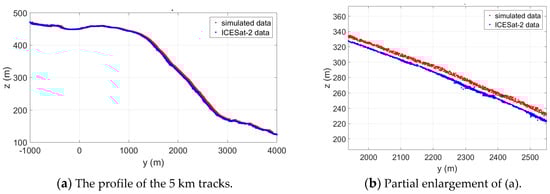 The simulated spaceborne photon-counting track (red) and the corresponding ICESat-2 track (blue). (a) is the profile of the 5 km data and (b) is a partial enlargement of (a).